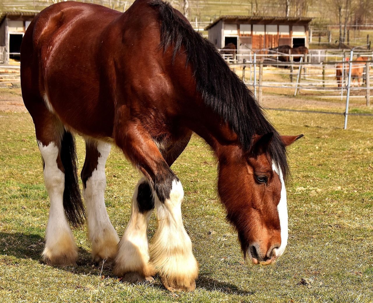The Shire horse is instantly recognisable. Standing between 16 and 18 hands high—sometimes taller—they are among the largest horses in the world. Their broad chests, muscular build, and feathered lower legs give them an imposing yet elegant appearance. Colours are typically bay, black, or grey, often with striking white markings on the face and legs. Despite their size, their calm and patient expression is a hallmark of the breed.