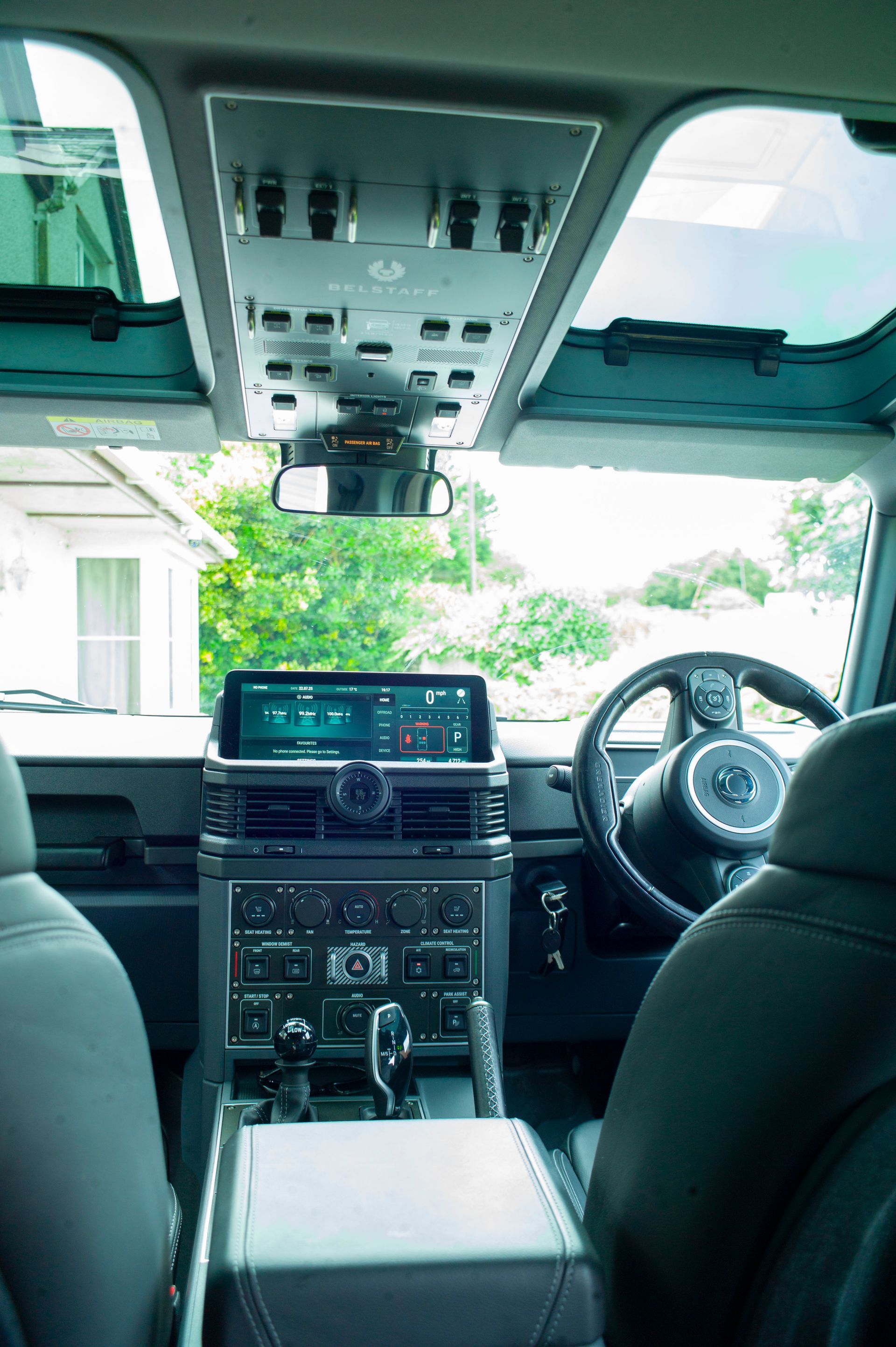 The dashboard, centre stack, overhead console, and door cards are finished in a deep Belstaff green, a nod to waxed jackets and oilskins, while a dark Orbit Grey headliner hushes the space and hides the inevitable fingerprints of children clambering in after a beach day. It feels like a proper working cockpit, but one with a knowing wink to luxury. Switchgear is satisfyingly analogue, the overhead panel begging to be flicked with gloved fingers on a January morning. It is a rare interior that invites mud on the mat and sand in the footwells without compromising its sense of occasion.